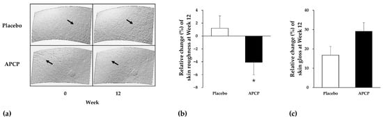 In the APCP group, cheek skin roughness decreased from 15.84 ± 2.57 at baseline to 15.18 ± 2.86 at week 12, whereas in the placebo group, it did not significantly change (14.84 ± 2.74 at baseline vs. 14.96 ± 2.69 at week 12). The relative mean change (%) in skin roughness differed significantly between the APCP and placebo groups (−4.09% and 1.21%) at week 12 (p = 0.036; Figure 3a,b).