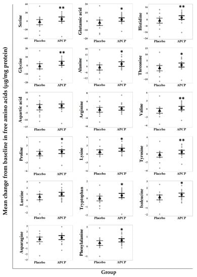 Amino acids (AAs) in the SC. Scatterplot of the changes in AA contents in the SC in the APCP and placebo groups after supplementation. Each gray dot represents a participant. The median is indicated by ▲ (placebo group) or ● (APCP group), and whiskers show the 95% confidence interval. * p < 0.05 and ** p < 0.01 vs. the placebo group, as determined using the independent t-test or Mann–Whitney U test.