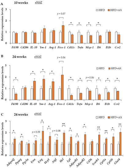 Figure 3. AX administration regulated the gene expression of pro-inflammatory markers and metabolic markers in the eWAT compared to HFD-treated control mice. Gene expression of pro-inflammatory and anti-inflammatory-related marker genes in eWAT of HFD-fed mice either 8 weeks (A) or 24 weeks (B) after AX administration. Gene expression of metabolism markers, including adipokines, lipolysis and energy metabolisms in eWAT of HFD treated for 10 weeks (n = 5–6 per group) (C). All values are presented as the means ± S.E.M. * p < 0.05, ** p < 0.01 (HFD vs. HFD + AX). Statistical analysis was performed using Student’s t-test.