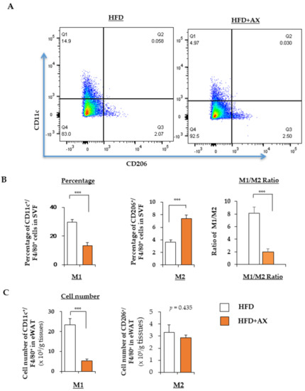 Figure 4. AX administration attenuated the infiltration of M1 macrophages (MΦ) into adipose tissue of HFD-fed mice. (A) Representative flow cytometry analysis of immune cells in eWAT of AX-treated HFD and HFD control mice (n = 6 mice/group). For this, the live cells were gated for CD45+ cells, followed by F4/80+ MΦ, and CD206+ M2 MΦ, and CD11c+ M2 MΦ. The percentages, their M1/M2 MΦ ratio (B) and the cell numbers (C) of M1 (CD11c+) and M2 (CD206+) MΦ relative to F4/80+ cells in the stromal vascular fraction (SVF) of eWAT from mice treated with HFD for 24 weeks. All values are presented as the means ± S.E.M. *** p < 0.001 (HFD vs. HFD + AX). Statistical analysis was performed using Student’s t-test.