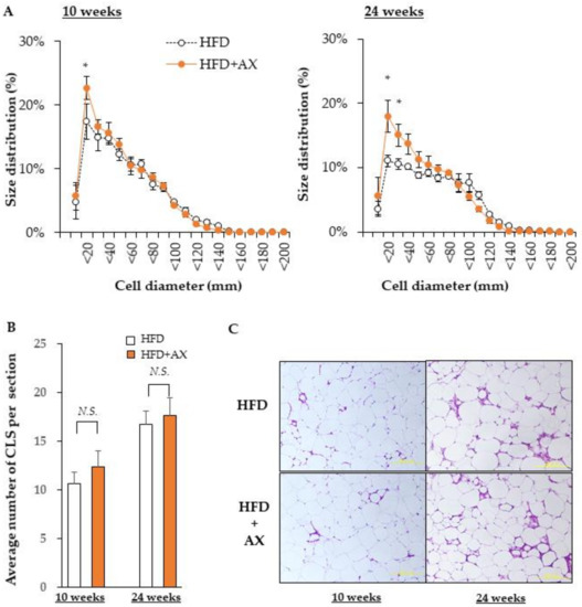 Figure 5. AX administration significantly altered the size of adipocytes in eWAT. (A) Diameter of adipocytes calculated from the area of adipocytes. (B) Average numbers of the crown like structures in each Hematoxylin and Eosin (H&E) stained section. (C) Representative H&E stained histological sections (n = 3–4/each group, each sample was measured in at least four sections). All values are represented as means ± S.E.M. * p < 0.05, N.S.: not significant (HFD vs. HFD + AX). Statistical tests were performed as follows: (A) two-way repeated-measures ANOVA, a post-hoc Dunnet’s-test for each point. (B) Student’s t-test.