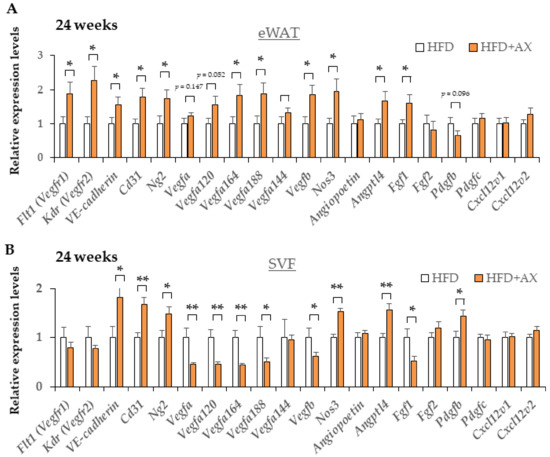 Figure 6. AX administration partially upregulated the gene expression of vascularization markers in eWAT and their SVF compared to HFD-treated control mice for 24 weeks. Gene expression of vascular marker genes in eWAT (A) and their SVF (B) (n = 5–6/each group). All values are represented as means ± S.E.M. * p < 0.05, ** p < 0.01 (HFD vs. HFD + AX). Statistical tests were performed as follows: Student’s t-test.