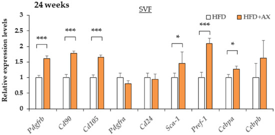 Figure 7. AX administration altered the gene expression of adipocyte progenitor cells, and mesenchymal stem cell markers in SVF compared to HFD-treated control mice for 24 weeks. Gene expression of adipose progenitor cells, and stem cell marker genes in SVF from eWAT of mice treated HFD for 24 weeks. (n = 5–6/each group). All values are represented as means ± S.E.M. * p < 0.05, *** p < 0.001 (HFD vs. HFD + AX). Statistical tests were performed as follows: Student’s t-test.