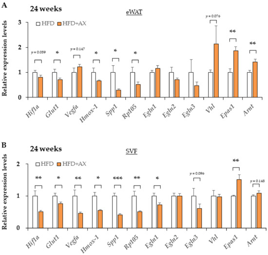 Figure 8. The hypoxic response altered from HIF-1 to HIF-2 dominant in eWAT and its SVF of AX-treated HFD mice compared to HFD control mice for 24 weeks. Gene expression of vascular marker genes in eWAT (A) and their SVF (B). (n = 5–6/each group). All values are represented as means ± S.E.M. * p < 0.05, ** p < 0.01, *** p < 0.001 (HFD vs. HFD+AX). Statistical tests were performed as follows: Student’s t-test.