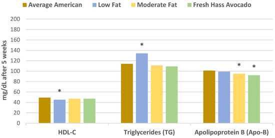 Compared to the average American diet: (1) the moderate fat and Hass avocado diets decreased HDL-C less than the low-fat diet (∗ p < 0.05); (2) the low-fat diet significantly increased TG by 18% (∗ p < 0.001), while there were small reductions in TG for the moderate fat and Hass avocado diets; and (3) both the Hass avocado and moderate fat diet significantly decreased Apo-B (∗ p < 0.0001) compared to the low-fat diet after 5 weeks [12].