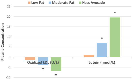 The Hass avocado diet significantly reduced ox-LDL plasma concentrations vs. low fat (∗ p = 0.03) and moderate-fat (∗ p = 0.05) and significantly increased lutein plasma concentrations vs. low-fat (∗ p = 0.0005) and moderate-fat (∗ p = 0.008) [13].