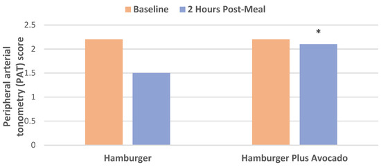 Postprandial 2 h after consuming hamburger plus half an avocado compared to plain hamburger improved PAT score compared to baseline (∗ p < 0.005) [19].