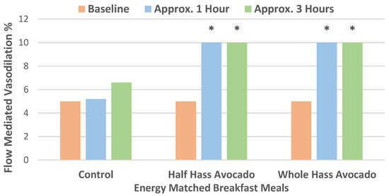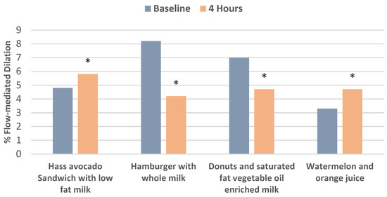 Isocaloric meals of a Hass avocado sandwich with low-fat milk and fruit consisting of watermelon and orange juice tended to increase flow-mediated dilation compared to significantly lower flow-mediated dilation (FMD) after hamburger and whole milk and donuts with saturated rich vegetable oil enriched milk after 4 h (∗ p < 0.05) [21].