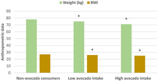 Effect of Hass avocado intake on body weight and BMI compared to non-consumers (∗ p < 0.0001) [25].