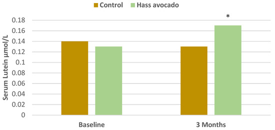 Change in serum lutein for Hass avocado group vs. baseline (∗ p < 0.001) [31].