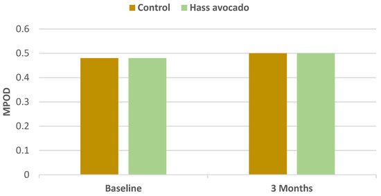 Change in macular pigment optical density (MPOD) for Hass avocado group vs. baseline and control group vs. baseline (p = 0.8) [31].