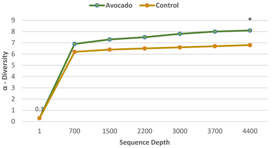Effect of diet group on α diversity in overweight and obese adults (avocado group vs. control group (∗ p-trend = 0.02) [34].