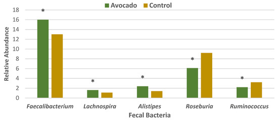 A parallel RCT was conducted in 157 overweight and obese adults (64% women, mean age 35 years, mean BMI 33, energy intake 1970 ± 289 kcals/day) who were randomly assigned to one of two isocaloric diets: (1) the avocado free control; or (2) one Hass avocado/day diet for 12 weeks [34]. Primary outcomes were fecal microbiota, fecal metabolites, and other health markers. The fecal microbiota was assessed with 16S ribosomal RNA gene sequencing, and analyses were made of fecal fatty acid and bile acid concentrations to assess bivariate correlations conducted between fecal microbiota, fecal metabolites, and health measures. The avocado group significantly increased α-diversity compared to the control group (Figure 12), and β-diversity tended to be greater for the avocado group than for the control (p = 0.09). At the genus level, the relative levels of Faecalibacterium, Lachnospira, and Alistipes were increased, and Roseburia and Ruminococcus were decreased compared to the control group (Figure 13). The avocado group had higher fecal acetate (p = 0.02) with a trend for higher fecal total short-chain fatty acids (SCFA) (Figure 14) and greater fecal stearic acid and palmitic acid concentrations compared to the control group, which appears to be associated with lower metabolizable energy (Figure 15). The avocado group tended to lower fecal primary, secondary, and total bile acid concentrations compared to control diets (Figure 16). This trial provides insights into Hass avocado’s beneficial effects on the colonic microbiota leading to improved metabolic health in at-risk overweight and obese adults.