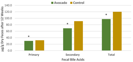 Hass avocado enriched diets tend to lower fecal primary, secondary, and total bile acid concentrations (∗ p < 0.1) vs. control diet in overweight and obese adults [34].