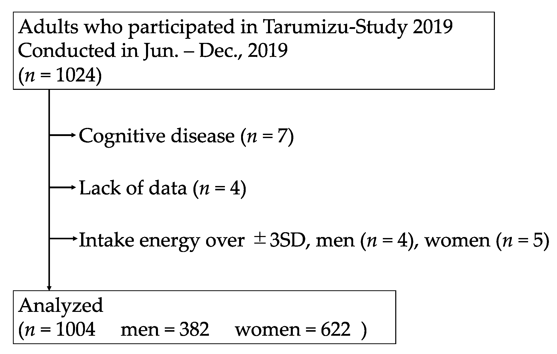 - Nomura, Y.; Ishii, Y.; Suzuki, S.; Morita, K.; Suzuki, A.; Suzuki, S.; Tanabe, J.; Ishiwata, Y.; Yamakawa, K.; Chiba, Y.; et al. Nutritional Status and Oral Frailty: A Community Based Study. Nutrients 2020, 12, 2886. [Google Scholar] [CrossRef] [PubMed]