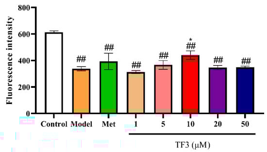 Glucose absorptions in different treatment HepG2 cells were measured by 2-NBDG glucose uptake assay kit (Figure 2). The results showed that glucose induction significantly decreased 2-NBDG absorption capacity in HepG2 cells (44.92%, p < 0.01). Glucose metabolism was weakened, and cells were unable to absorb glucose in medium, meaning that insulin resistance cell model was successfully established. With the increasing concentration of TF3 treatment, the glucose absorption capacity of insulin resistance HepG2 cells increased first and then decreased. Cell 2-NBDG uptake significantly increased after 10 μM TF3 treatments (p < 0.05). These results suggested that TF3 had the tendency to restore insulin resistance and 10 μM TF3 could efficiently improve the insulin sensitivity of HepG2 cells model.