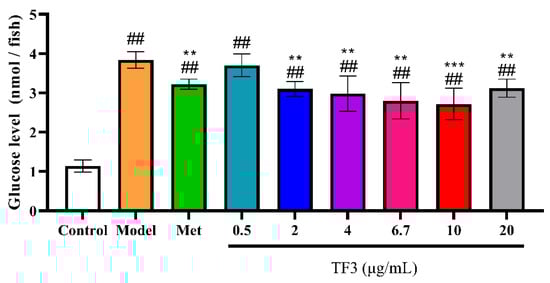 TF3 treatment reduced glucose level in zebrafish. Results were expressed as the mean ± SD (n = 5). Control, water culture; model, water with 1 μM alloxan and 4% glucose culture for 24 h; TF3, water with different concentrations of TF3 (0.5, 2, 4, 6.7, 10, and 20 μg/mL) treating for 24 h after alloxan-treatment; Met, water with metformin hydrochloride (10 μg/mL) treating for 24 h after alloxan-treatment. ## p < 0.01 versus control group. ** p < 0.01 versus model group, *** p < 0.001 versus Model group.