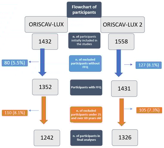 Finally, the data of 1242 participants from ORISCAV-LUX and 1326 participants from ORISCAV-LUX 2 who completed the FFQ and were in the same age ranges were included in our analyses (see the flowchart of participants, Figure 1).