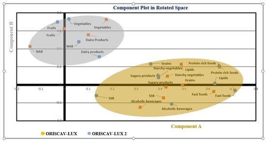 The exploratory factor analysis (EFA) was used to identify two major components, using the data from the FFQ organized into 12 major food groups. A component plot in rotated space for both ORISCAV-LUX and ORISCAV-LUX 2 is represented. Component A included fast foods (ready-to-eat meals), lipids, grains, starchy vegetables, alcoholic beverages, SSB (sugar-sweetened beverages), sugary products, and protein-rich foods. Component B included fruits, vegetables, NAB (nonalcoholic beverages), and dairy products.