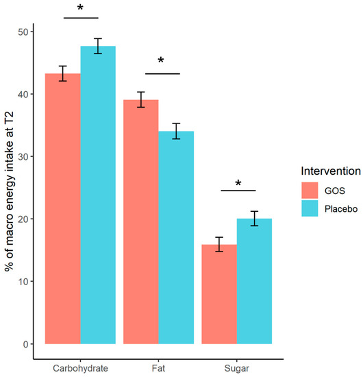 Significant treatment effects from ANCOVA tests on nutrient intake at T2 for carbohydrates, fat, and sugars (n = 23 in each group). The GOS intervention shows reduced total carbohydrate and reduced sugars compared to the placebo group and increased total fat intake. Error bars are standard error of the mean. * p < 0.05.