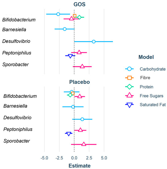 Coefficients from significant stepwise regressions for each nutrient model (carbohydrate, fibre, protein, free sugars, and saturated fat), represented by different colors and point shapes. Only genera which had a significant contribution on model outcomes are plotted. Treatment groups (GOS and Placebo) are plotted separately for ease of viewing. The further the data point from central zero the larger the coefficient and strength of effect. Data points to the left of zero are negative coefficients, illustrating a negative relationship of the predictor to nutrient outcome, and data point to the right are positive coefficients, representing a positive relationship. In the carbohydrate model (blue), GOS Bifidobacterium and Desulfovibrio are significant coefficients. In the Fibre model (orange), placebo Bifidobacterium is a significant coefficient. The Protein model (green) found GOS Bifidobacterium a positive significant coefficient and placebo Bifidobacterium a negative significant coefficient. The free sugar model (pink) found placebo Bifidobacterium and Peptoniphilus to be significant coefficients and in the saturated fat model (dark blue) placebo Peptoniphilus a negative significant coefficient.