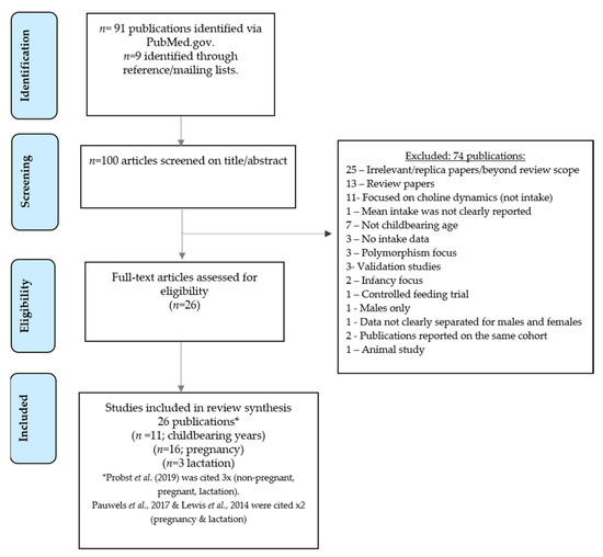 The publication inclusion criteria were human studies in English language reporting habitual choline intakes from the diet in women aged 16–50 years (as a main aim) and published between 2004 (1 January 2004) and 2021 (15 November 2021). This timeframe was specified due to the United States Department of Agriculture (USDA) Food Composition Databank being completed in 2004 [23]. The population(s) of focus were women of childbearing age (16 to 50 years) defined as those who were nonpregnant, pregnant, or lactating [24].