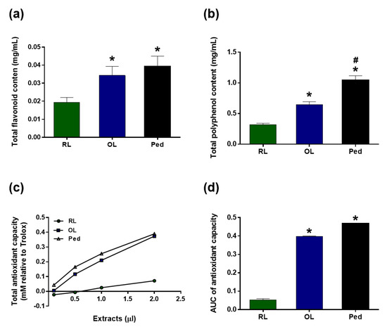 Antioxidant content of raw leaves (RL), oxidation-treated leaves (OL), and peduncles (Ped). Total flavonoid content (a) and polyphenol content (b). Total antioxidant capacity was measured via the ABTS assay (c), and the AUC is represented (d). Data are presented as the means ± SEM. * p < 0.05 versus RL; # p < 0.05 versus OL.