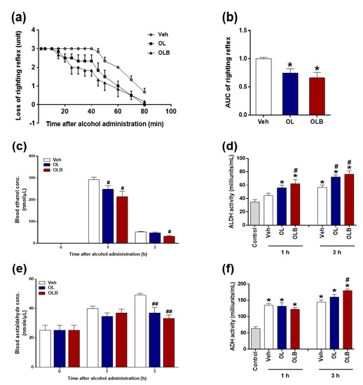 Effect of two extracts, oxidation-treated leaves (OL) and oxidation-treated leaves and branches (OLB), on alcohol tolerance time following acute ethanol-loading in mice. Mice were treated with water (Veh), OL, or OLB 1 h before injection of 4.5 g/kg ethanol (n = 6, respectively). Loss of stereotactic reflexes was monitored for 80 min, scores of behavioral changes were plotted over time (a), and the area under the curve (AUC) was calculated (b). Blood ethanol (c) and acetaldehyde (e) levels were measured. OL and OLB decreased blood ethanol and acetaldehyde concentrations in ethanol-injected rats. Mice were treated with water, OL, or OLB 1 h before 1.5 g/kg (c–f) ethanol injection (n = 8, respectively), and blood was collected 1 and 3 h later. As a control group, an untreated treatment group (n = 5) was included. In ethanol-injected mice, OLB increased the activity of ethanol-metabolizing enzymes. Hepatic activity of alcohol dehydrogenase (ADH) and aldehyde dehydrogenase (ALDH) in liver tissue was measured 1 and 3 h after ethanol injection (d,f). Data are presented as the means ± SEM. * p < 0.05 versus control, # p < 0.05 versus Veh; ## p < 0.01 versus Veh.