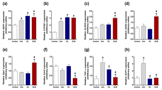 The gene expression changes of superoxide dismutase 2 (SOD2) and glutathione peroxidase 1 (Gpx1) related to acute alcohol liver injury were investigated at 3 h after alcohol injection. Interestingly, significant increments were found in the OLB group for SOD2 and Gpx1 (Figure 4d,e). We also measured the expression changes of inflammatory related genes, Cox2, TNF-α, and MCP 1 [23], and found OLB remarkably suppressed those gene expressions (Figure 4f–h). Alanine transaminase (ALT) and aspartate aminotransferase (AST), landmarks for liver function, were also examined, and OLB administration was found to significantly suppress their activity compared with that of the Veh group at 3 h (Figure 5a,b).