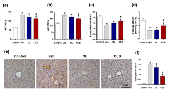 OLB treatment prevents acute ethanol-induced liver damage. Mice were treated with water (Veh), OL, or OLB 1 h before injection of 1.5 g/kg ethanol, and blood and liver tissues were collected 3 h later. As a control group, an untreated treatment group (n = 5) was included. Blood was collected, and plasma (a) ALT and (b) AST levels were measured. The ratio of reduced glutathione (GSH) to oxidized glutathione (GSSG) (c) and catalase activity (d) in mice liver tissue were measured after ethanol injection. Liver sections from each group were processed for representative immunohistochemistry of nitrotyrosine-positive signals, and representative images are shown (e). Nitrotyrosine score was measured (f). The data are presented as the means ± SEM. * p < 0.05 versus control; # p < 0.05 versus Veh. Scale bar = 50 µm.