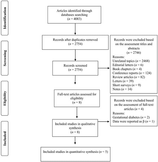 Our search strategy retrieved 4083 studies and, after removing duplicates records, 2754 studies remained. The titles and abstracts of these studies were assessed and 2745 records were subsequently excluded based on our inclusion criteria. Eight full-text articles were reviewed and three of these studies were omitted due to the following reasons: two studies were conducted on women with gestational diabetes [30,31] and one study reported relevant data as βeta coefficients [32] (Figure 1). Five studies met our inclusion criteria and were included in our meta-analysis [7,19,20,21,22]. The characteristics of the included studies are summarized in Table 1 and described below. Of the five included studies, four were prospective cohort study designs [7,19,20,22] and the other was cross-sectional [21]. The follow-up duration for the cohort studies ranged from 3.4 to 12.0 years. The selected studies were published between 2019 and 2021 and were carried out in France [19], Spain [22], Netherlands [20], United Kingdom [7] and Canada [21]. The study-specific, maximally adjusted OR, HR, or RR were extracted across the selected studies and were pooled for meta-analysis to evaluate the association between UPF consumption and the risk of T2DM in a total of 230,526 adults. The quality of studies assessed via the Newcastle–Ottawa Scale indicated that all of the included articles had high quality (≥8 stars) (Table 1).