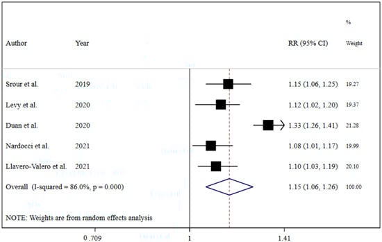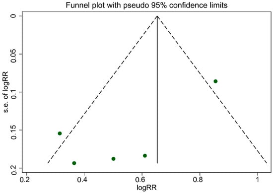 As illustrated in Figure 5, the funnel plot was asymmetrical, which indicated publication bias. The evidence of publication bias among studies associated with UPF consumption, which is related to an increased risk of T2DM, was confirmed according to Egger’s regression asymmetry (p = 0.007). However, Begg’s rank correlation tests (p = 0.463) result did not show publication bias among studies.