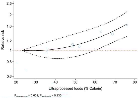 The results revealed that UPF consumption was associated with an increased risk of T2DM (RR = 1.74; 95% CI: 1.36, 2.22; I2 = 68.9%; p < 0.001) (Figure 2). Linear dose-response analysis indicated that each 10% increase in UPF consumption was associated with a 15% higher risk of T2DM (RR = 1.15; 95% CI: 1.06, 1.26; I2 = 86.0%; p < 0.001) among adults (Figure 3). Moreover, non-linear dose-response associations are shown in Figure 4. This analysis demonstrated a positive linear association between UPF consumption with T2DM (pnonlinearity = 0.13, pdose-response ≤ 0.001) among adults.