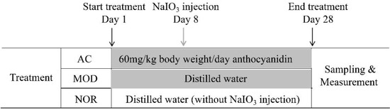 A total of 36 SD rats were randomly separated into 3 groups (NOR, MOD, and AC groups), 12 rats each group. In AC group, aronia fruit extract in distilled water was administrated orally once a day using a stomach tube at an equivalent anthocyanidin concentration of 60 mg/kg body weight (the amount of Aronia fruit extract powder is 600 mg/kg body weight) for 28 days. A single treatment of NaIO3 at 30 mg/kg body weight was intravenous injected to the rats of this group on day 8 after the start of feeding aronia water extract.