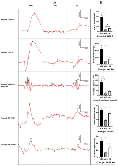 Five different electrical currents in the rat retina of each group were measured according to the ISCEV (International Society of Clinical Electrophysilological Vision) standard. The results showed the ERG b-wave amplitudes for all five different measurements were significantly decreased in the MOD group (p < 0.01, Figure 2), compared with those in the NOR group. This indicated a serious damage on the rat retina of the MOD group. The decrease of ERG b-wave amplitudes in Scotopic 0.01ERG, Photopic 3.0ERG, and Photopic 3.0 flicker of the AC group was reduced compared to the MOD group (p < 0.05, Figure 2B). According to the ISCEV Standard, Scotopic 0.01ERG indicates a rod-driven response of bipolar cells, Photopic 3.0ERG indicates responses of the cone system, b-wave comes from On- and Off-cone bipolar cells, and Photopic 3.0 flicker is a sensitive cone-pathway-driven response. The results suggested that the damage of retina induced by NaIO3 was alleviated in the AC group, and aronia fruit extract showed a potential protective effect on rat retina, especially on cone system.