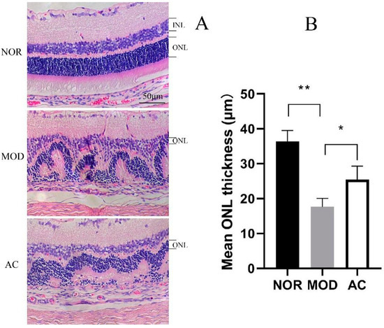 The pictures stained with the H&E of rat retina show that the NOR group has a clear retina structure and layers, and the cell nuclei were neatly aligned. In the MOD sample, the retina showed a disordered structure, and a reduction of cell layers with a messed outer and inner nuclear layer (ONL and INL). In comparison, the AC group showed an improvement on its retina structure and cell layers, the alignment of their nucleus was relatively in order compared with the MOD group (Figure 3A). The NaIO3 treatment dramatically reduced the thickness of ONL, suggested a progressive ONL thinning. However, the administration of aronia fruit extract can reduce the damage by NaIO3 and maintain the ONL thickness (Figure 3B).