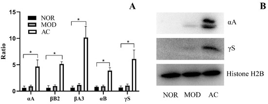 The amounts of αA and γS in rat retina were detected using immunoblotting. As shown in Figure 5B, both αA and γS were not detected in the NOR group. Very low amounts of the two proteins were detected in the MOD group. However, αA and γS had a significantly higher expression in the rat retina of the AC group, compared to the MOD group. The results confirmed the mass spectrum results shown in Figure 5A.