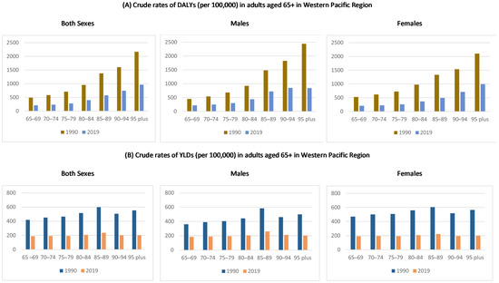 Age-specific (A) DALYs, (B) YLD crude rate by both sexes, male, and female, in the Western Pacific region from 1990 to 2019. Note: Points in the Y-axis indicate estimates of the rates per 100,000 population.