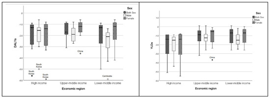 Mean values of the age-standardized rates in DALYs and YLDs attributed to nutritional deficiency and their correlations with SDI by sex are presented in Table 3. On average, females demonstrated a significantly greater age-standardized rate in DALYs (mean difference = 506.44, 95% CI (422.42, 598.28), p-value < 0.001) and in YLDs (mean difference = 387.76, 95% CI (360.82, 416.22), p-value < 0.001) than their male counterparts. Strong and negative correlations between the age-standardized DALYs rate attributed to nutritional deficiency and SDI (correlations < −0.84, p-values < 0.001) were observed in both sexes, males and females. For YLDs, negative correlations with SDI were observed, with strong correlations in both sexes and females (correlations < −0.84, p-value < 0.001) and moderate correlations (correlation = −0.682, p-value < 0.001) in males.