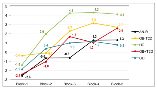 Performance learning curve (IGT task). Note. AN-R: anorexia nervosa restrictive. OB − T2D: obesity without T2D. HC: healthy control. OB + T2D: obesity with T2D. GD: gambling disorder. Y-axis represents the means adjusted by sex, age, education, and BMI.