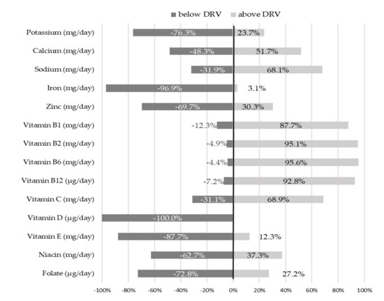The percentage deviation of micronutrient intakes from Italian DRVs [8], expressed using PRI and AI, are shown in Figure 1.