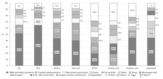 The main source of total fats and FAs was the milk and dairy products food group. Other significant sources of cholesterol were meat (14.2%), eggs (12.3%) and baby foods and snacks (9.9%). Fats and oils and baby foods and snacks were the other two food groups providing fat intake, with PUFAs also deriving from cereal-based products (10.2%), meat (8.7%) and cured meat (8.7%).