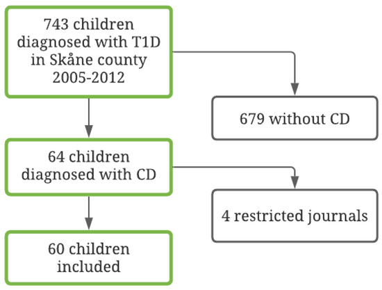 Children with type 1 diabetes (T1D) have an increased risk of being diagnosed with celiac disease (CD) compared to the general population [1]. The estimated prevalence of CD in children is approximately 1% [2], while the prevalence of CD in children with T1D ranges between 2.4 and 16.3% [3], reflecting national and international differences in CD diagnostics and CD risk [1]. The prevalence of CD in Swedish children with T1D is around 10% [4,5]. T1D and CD are chronic diseases that share genetic risk factors such as HLA DQ2 and DQ8 [6]. The incidence of both diseases has increased during the last few decades [7,8,9], pointing towards possible environmental risk factors [10].
