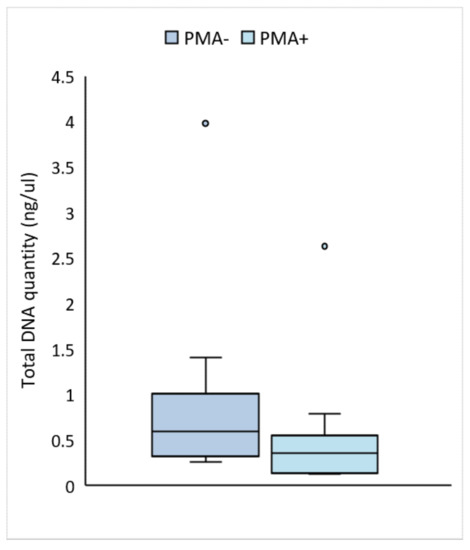 - Nocker, A.; Sossa-Fernandez, P.; Burr, M.D.; Camper, A.K. Use of propidium monoazide for live/dead distinction in microbial ecology. Appl. Environ. Microbiol. 2007, 73, 5111–5117. [Google Scholar] [CrossRef] [PubMed] [Green Version]