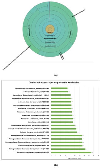 (a) Sunburst chart shows the relative abundance of the bacterial classification within each taxonomic level. Kingdom: Bacteria; Phylum: Proteobacter; Class: Alphaproteobacteria; Order: Rhodospirillales; Family: Acetobacteraceae; Genus: Acetobacter and Komagataeibacter; Species Acetobacter_estunensis and Komagataeibacter Gluconacetobacter_intermedius. High- percent of reads (57.37%) match with dominant genus Acetobacter while 34.16% reads are assigned to genus Komagataeibacter. (b) Different dominant bacterial species in kombucha samples. Acetobacter Acetobacter estunensis is the most abundant followed by Komagataeibacter Gluconacetobacter_intermedius species. The error bars are standard error (SE) calculated across the triplicate values of samples.