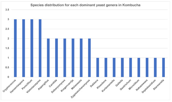 Abundance of yeast species each dominant genus has in kombucha. On average, genus Cryptococcus, Hanseniaspora, Penicillium and Vishniacozyma show three different species across kombucha samples.