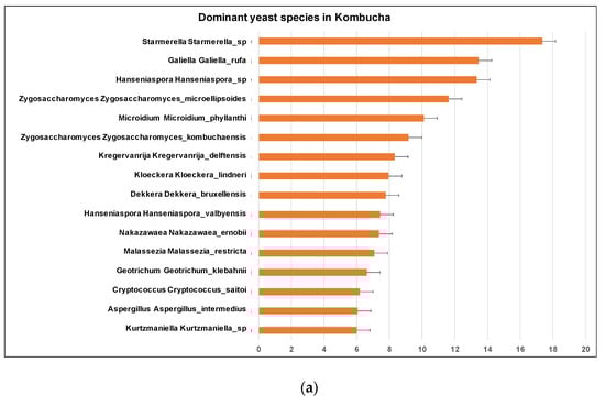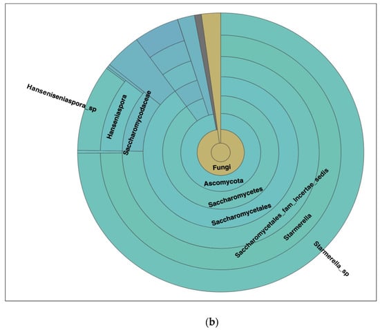 Similar to 16S results, a greater number of ITS-metagenomic reads (97%) were classified to the taxonomic level using UNITE fungal ITS database v 7.2. A total of 117 yeast genera were identified which comprised 139 yeast species. The most dominant genera found in original base kombucha are Starmerella, Galiella, and Hanseniaspora (Figure 4). Total 77% reads classified to genus Starmerella, 10% to Hanseniaspora, 5% to Galiella and 3% to Zygosaccharomyces genus. These genera showed high species diversity where genus Hanseniaspora had three species, Zygosaccharomyces had two and Starmerella had only one species (Figure 5). Starmerella sp. has been reported in wine fermentation and it significantly contributes to the microbial ecology of the fermentation. These yeast species cope well with sugar niches and are reported to produce low amounts of acetic acid, glycerol and acetaldehydes as a result of sugar fermentation. The most dominant yeast species is Starmerella sp. with 78% ITS reads classified to this species. The second most dominant species is Galiellea rufa (10% reads), Hanseniaspora sp. (6% reads) and Zygosaccharomyces microellipsoides (3% reads) classified to these species (Figure 6a,b).