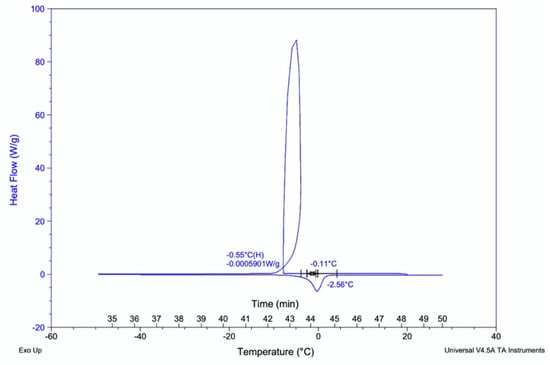 Glass-transition temperature curve for kombucha samples. The polymers begin transition to glass state at temperatures −2.56 °C to −0.11 °C. Heat flow (W/g).