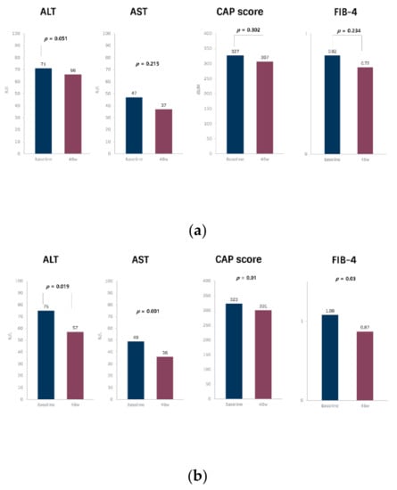 When analyzed within each group, AST (p = 0.001), CAP score (p = 0.01) and FIB-4 (p = 0.003) were improved with statistical significance after 48 weeks of nutritional education in MNT group (Figure 2). Among metabolic factors, total cholesterol and LDL cholesterol were significantly improved from baseline in both groups. Fibrosis factors except for FIB-4 were not changed significantly.