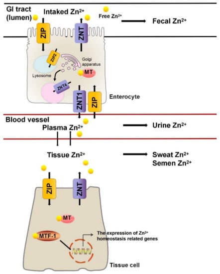Zn2+ is excreted from the body in the feces through the GI tract. When dietary Zn2+ intake is reduced, the levels of transporters responsible for Zn2+ absorption in the gut are increased and the expression of transporters responsible for Zn2+ excretion are decreased []. It has been reported that the pancreas plays an important role in Zn2+ excretion. Pancreatic acinar cells are rich in Zn2+-requiring proenzyme granules. ZNT2, a Zn2+ transporter, is distributed in proenzyme particles and participates in the transport of proenzyme granules in pancreatic acinar cells through the MTF-1 regulatory pathway, leading to the control of the excretion of Zn2+ from the pancreas []. Other physiological pathways for the loss of Zn2+ include sweat, urine, and semen []. The above findings indicate that ZNT, ZIP, MT, MTF-1, and albumin are involved in regulating the balance of Zn2+ concentrations, the dysfunction of which can lead to Zn2+ homeostasis disorders (Figure 1).